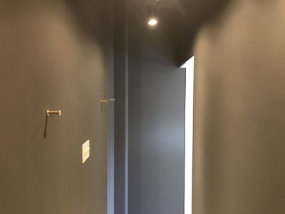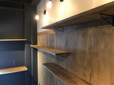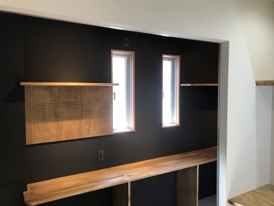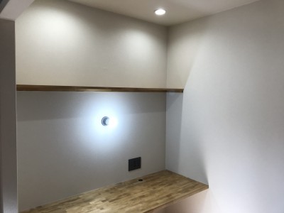 明石市に位置する戸建て住宅の一部のリノベーション。元々店舗として使われていた部屋をテレワークとアトリエを兼ね備えた部屋にリノベーション。テレワークのスペースを中心に取り囲むように通路兼作品展示、作品作業ができる作業台や棚板を設置。全体的にトーンを落とした雰囲気にし、テレワークの部分だけ明るめな雰囲気にしています
