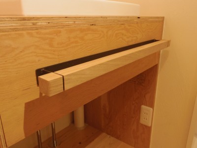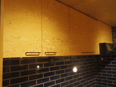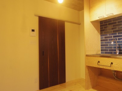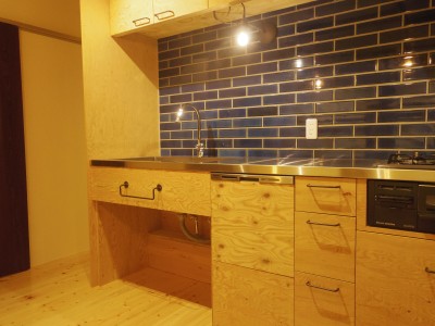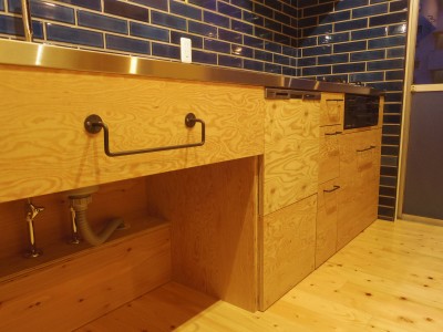 キッチンは初めから、オリジナルで作りたいというご要望があったのですが費用的に難しい部分がありました。しかし材料を構造用合板(ラーチ)とすることでコストを抑え必要な所だけ引出し収納を設置することで、ご希望のオリジナルキッチンとしています。