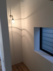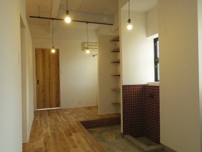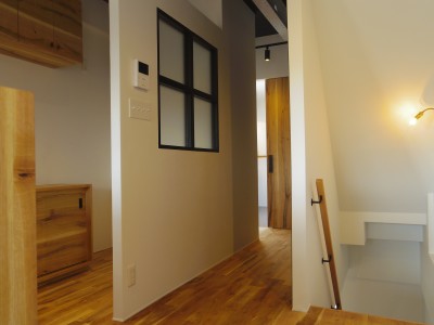 1階の玄関は構造上支障がない程度に広げています。お子様がまだ小さいので、この玄関で遊べるスペースとしても活用できるようにしています。また手洗い場も設けているので、外で砂遊びなどして帰ってきても直ぐに手が洗えるようにもしています。