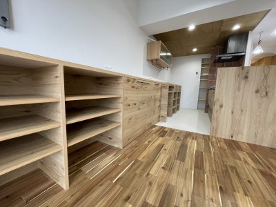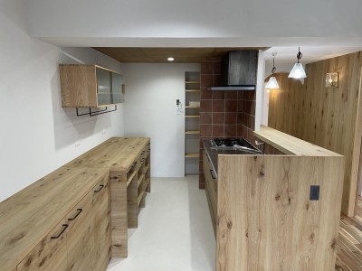 • キッチンは対面に変更し背後にスライド台を兼ねた食器カウンターと収納カウンターで収納力アップ