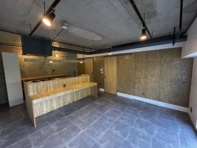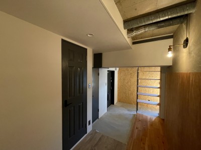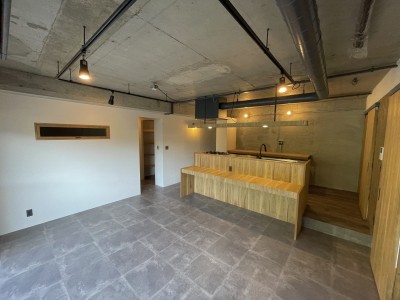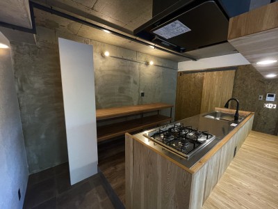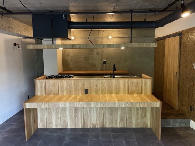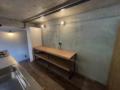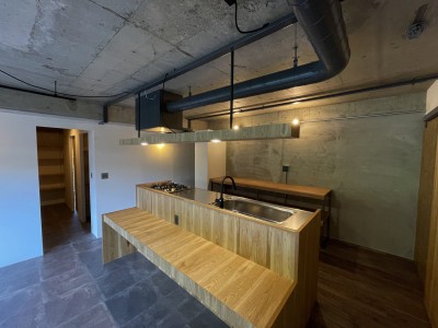 一方LDKは、コンクリート現しの天井と換気扇のダクトで無機質な雰囲気としながらも、キッチン上に設けたオリジナル照明やOSB合板の壁などで暖かみもある空間としています