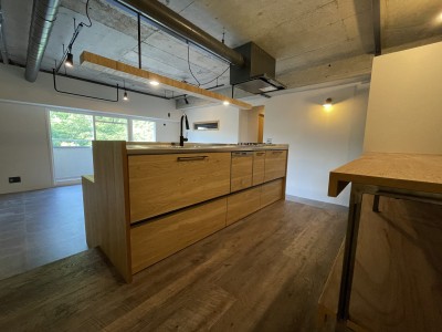 キッチンは、メーカーのキッチンにオークの突板で作り直ししています。