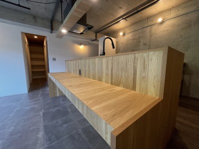 - 壁付キッチンから対面キッチンとし、パントリーの増設とダイニングテーブルを併設するカウンターを設置