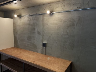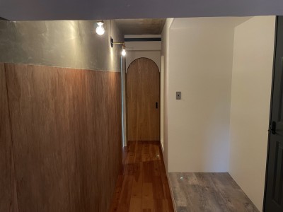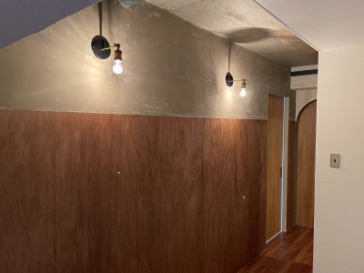 廊下には、オイル塗装したラワン材とモルタルを使った壁として、暖かみのあるミッドセンチュリーの雰囲気としていいます