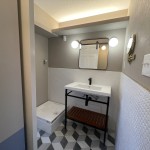 - 生活感でない様に配慮した靴収納の確保と使える設備は再利用してコスト削減